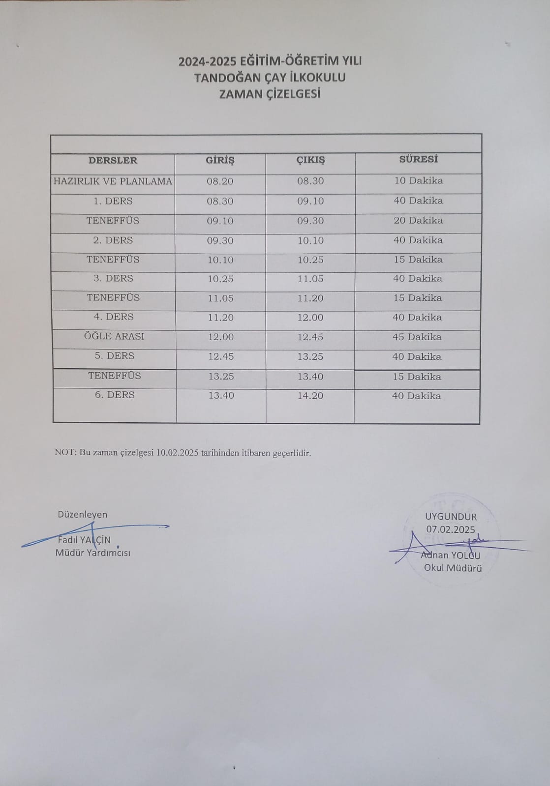 10.02.2025 tarihinden itibaren okulumuzda uygulanacak olan Zaman Çizelgesi aşağıda sunulmuştur.